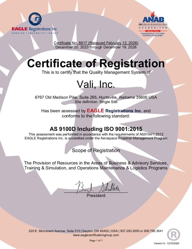 Vali is a Service-Disabled, Veteran-Owned Small Business (SDVOSB) comprised of a team of professionals brought together by the merger of Vali, Inc, Defense Acquisition, Inc., and ALOG Corporation. Vali is AS 9100D Certified with ISO 9001:2015 and has a DCAA Approved accounting system. Vali’s core competencies include Business & Acquisition Management, Test & Evaluation Support, Safety & Mission Assurance Services, Training & Simulation, Information Technology, and Logistics Support Services. The Vali Team has a long history of providing support to the Department of Defense and our current customers include the U.S. Army, U.S. Air Force, U.S. Navy, the Missile Defense Agency (MDA), and the Defense Logistics Agency (DLA).
